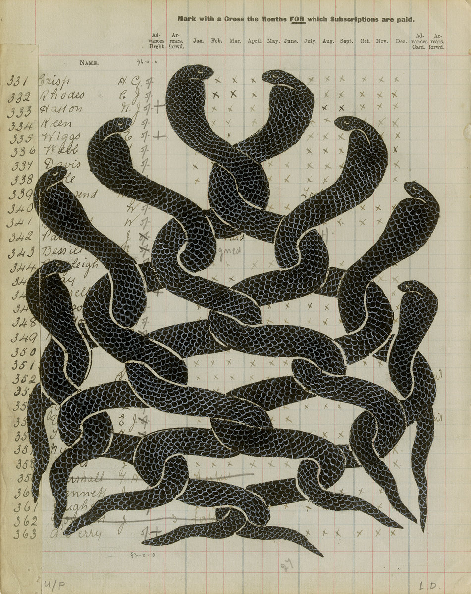Front cover hand-stamped with a circular snake and signed by Lauren Drescher